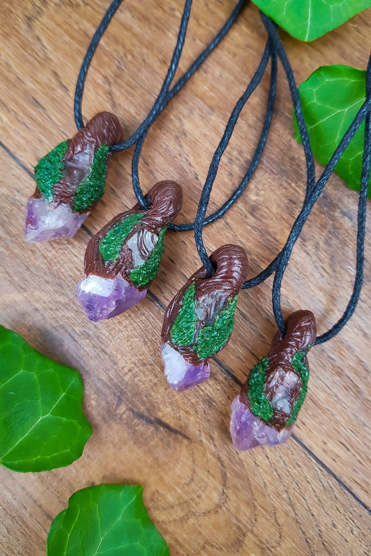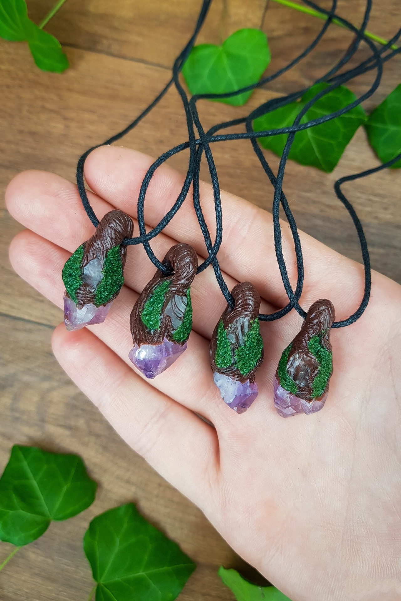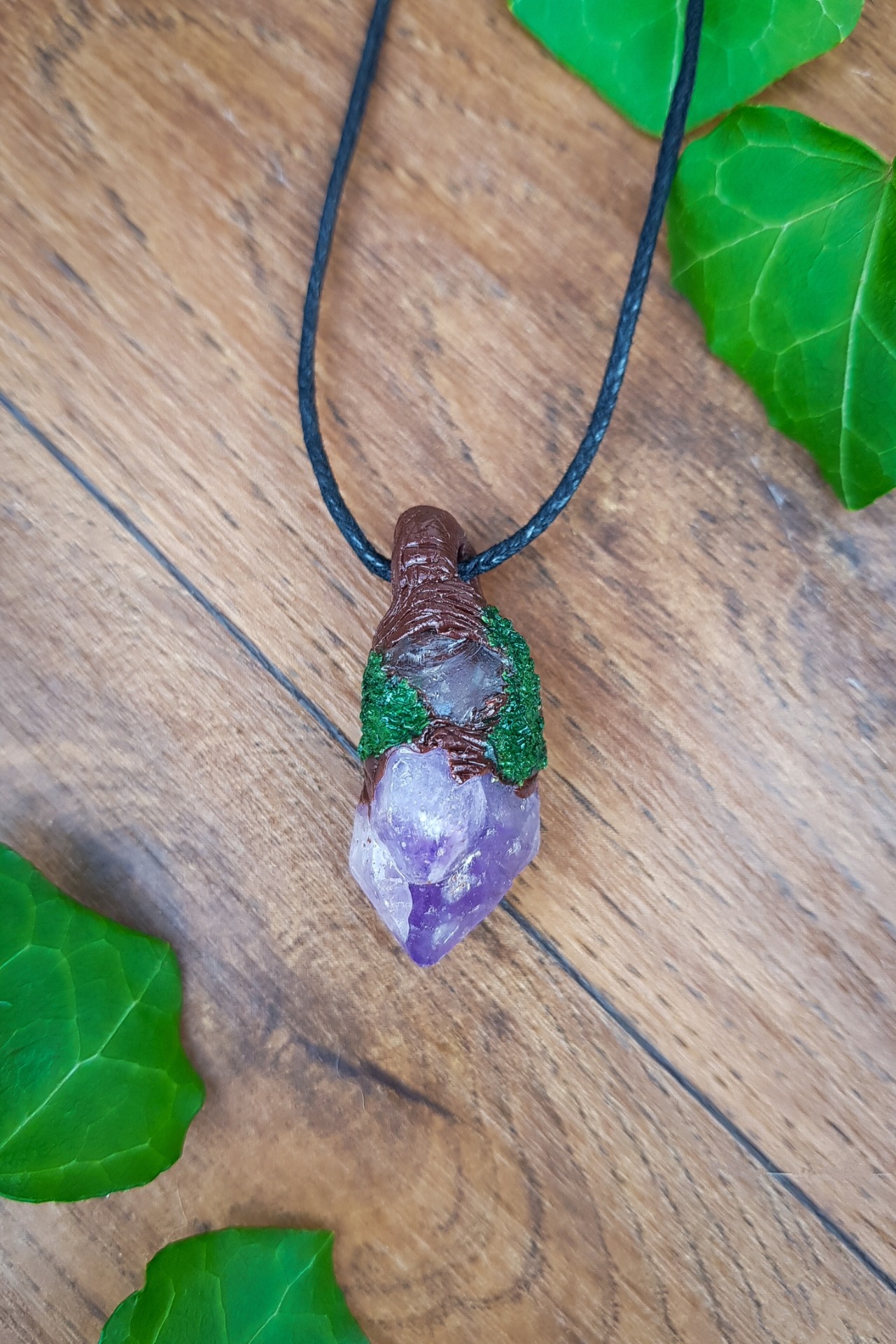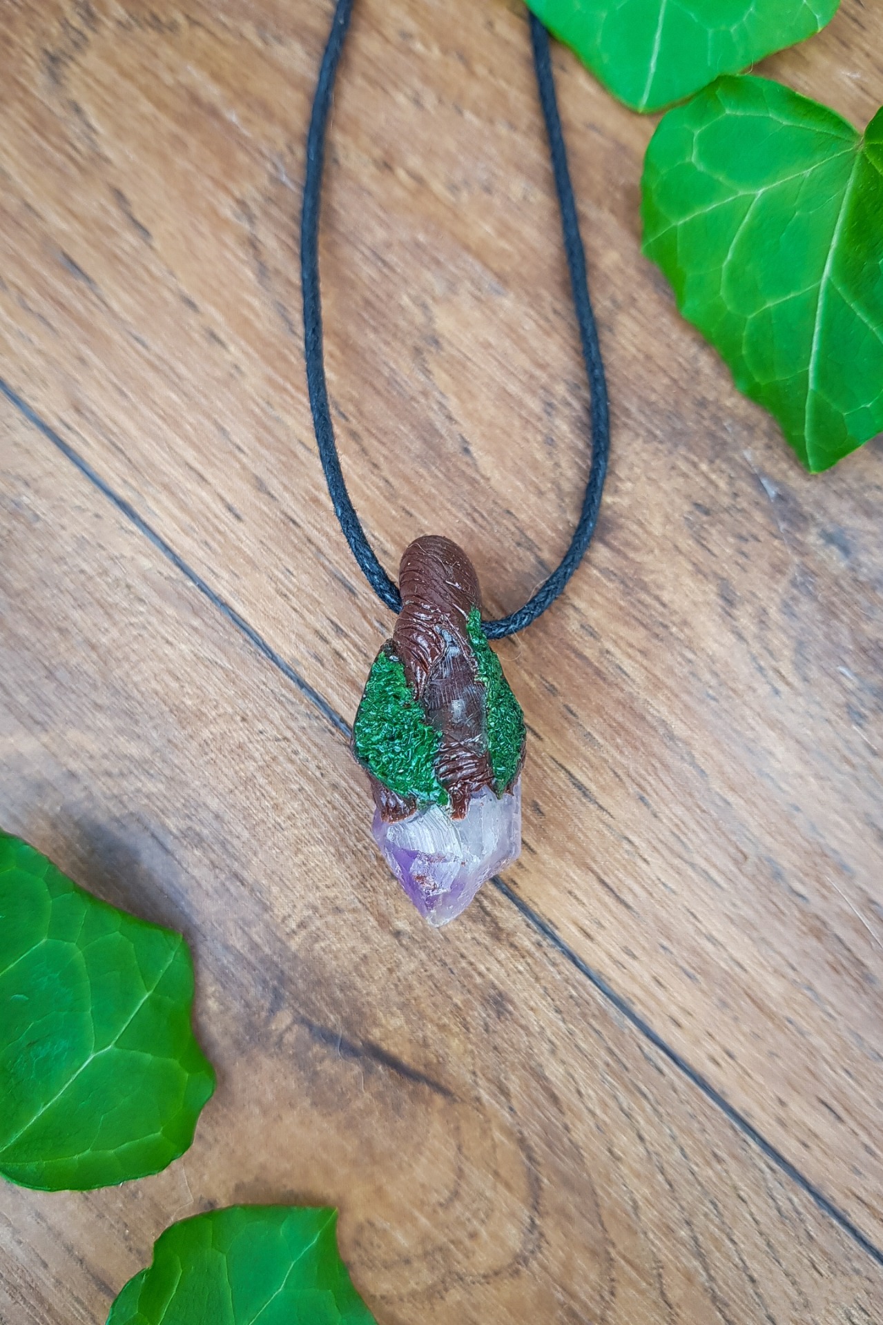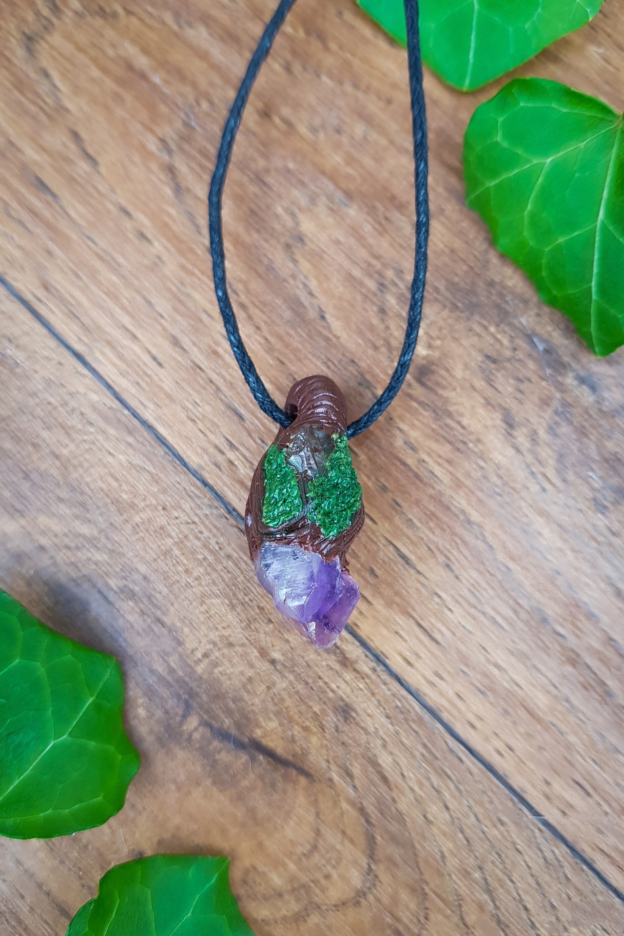 Ručně vyráběný náhrdelník imitující dřevo porostlé mechem s minerálem (hrot ametystu)