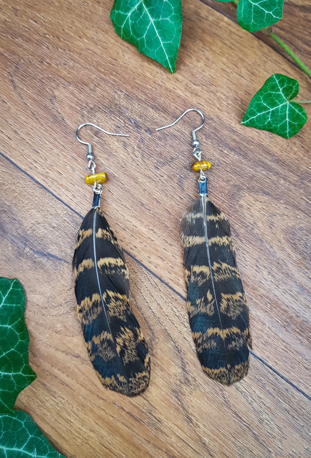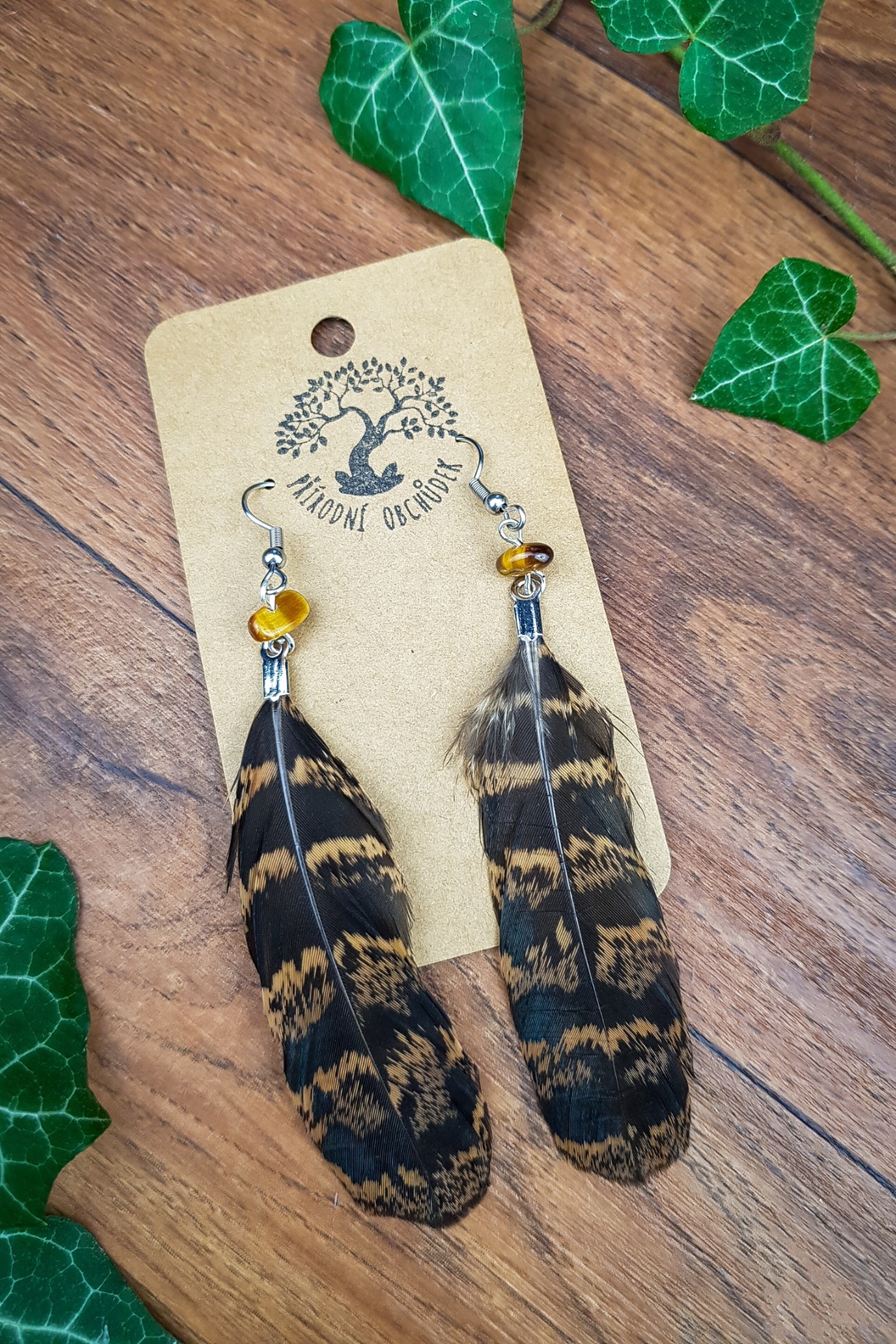 Ručně vyráběné peříčkové náušnice s minerály - tygří oko.Materiál je vhodný i pro alergiky