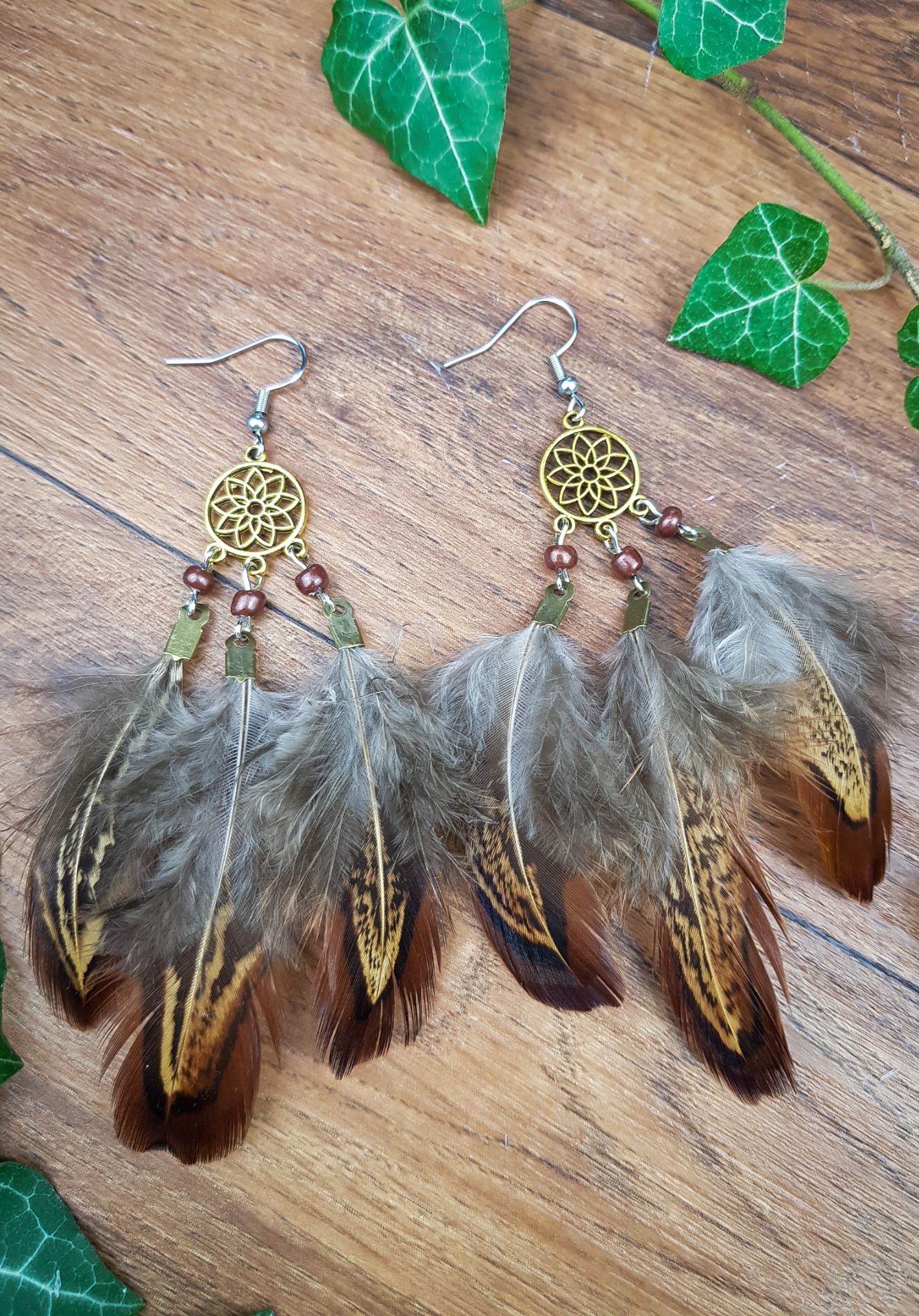 Ručně vyráběné náušnice lapač snů s jemnými peříčky a korálky