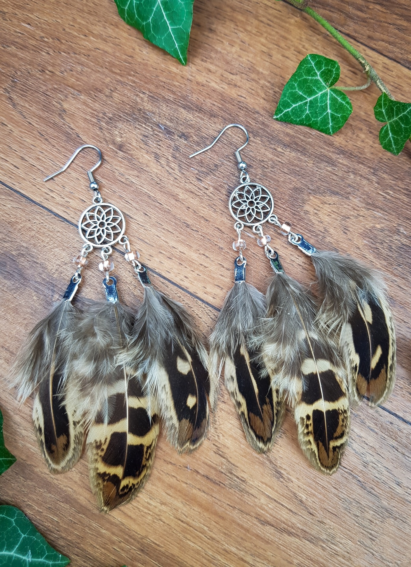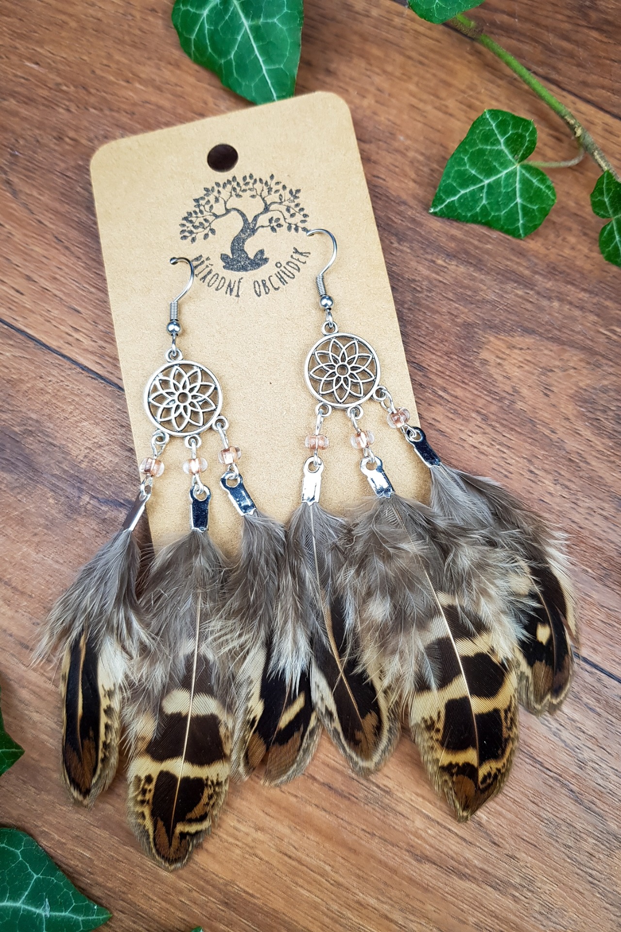 Ručně vyráběné náušnice lapač snů s jemnými peříčky a korálky