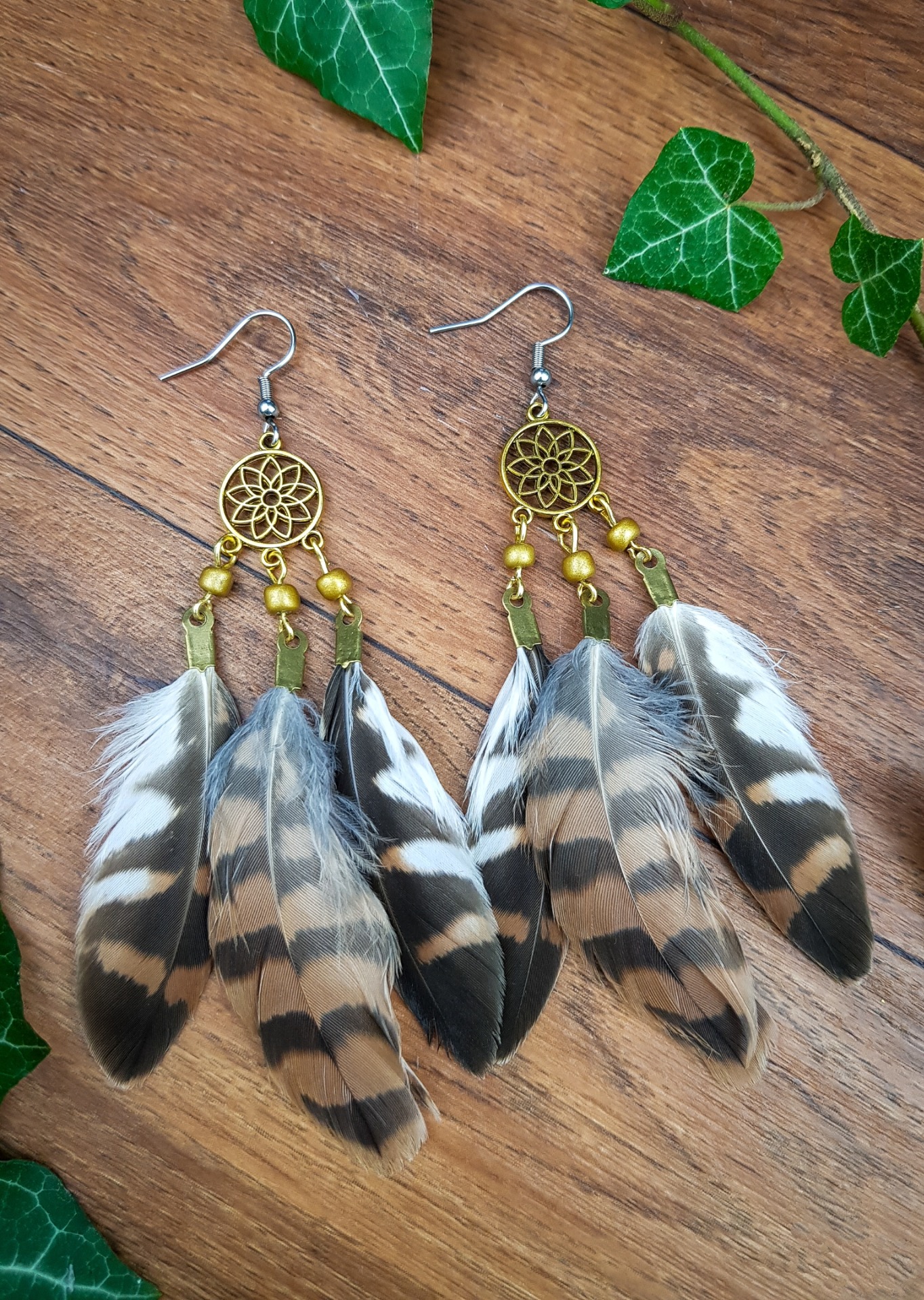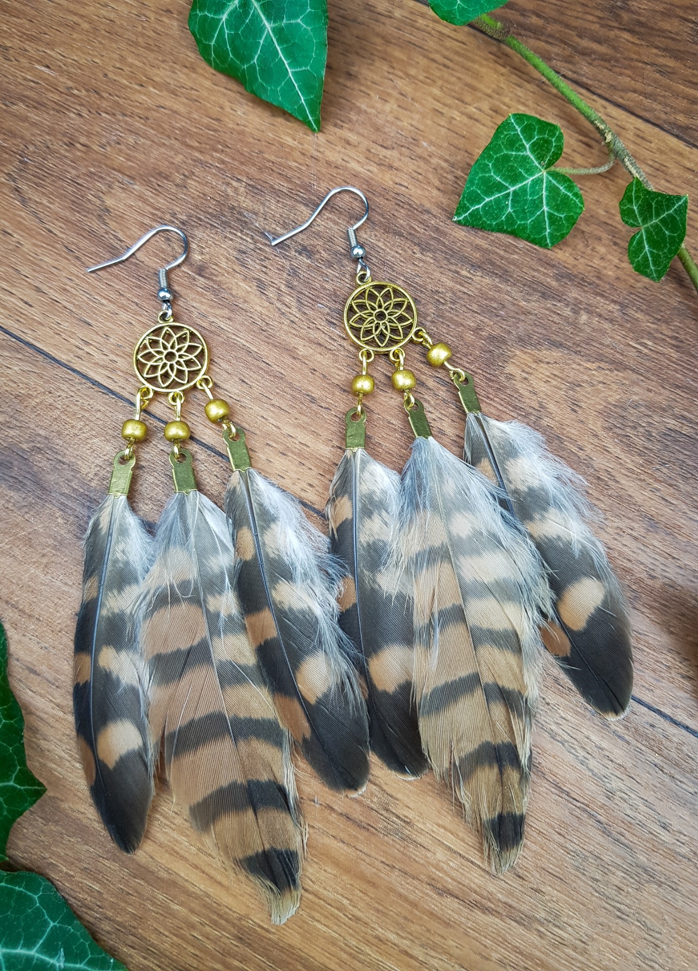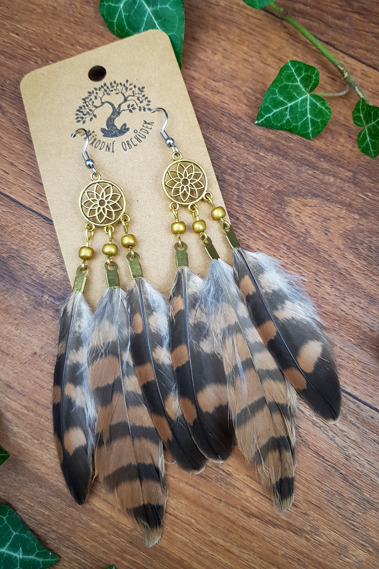 Peříčkové náušnice - lapač snů - zlatohnědé